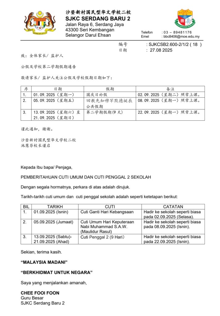 [通告]公假及学校第二学期假期通告[NOTIS]PEMBERITAHUAN CUTI UMUM DAN CUTI PENGGAL 2 SEKOLAH